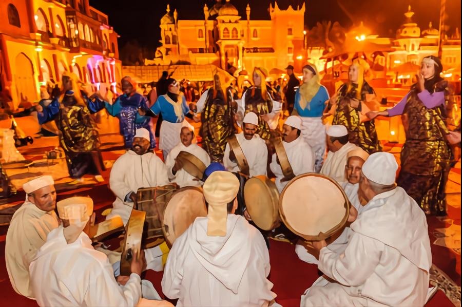 Envoûtés par les chants et danses des groupes folkloriques, on mange, on entend et on voit ce qu’on ne trouve nulle part ailleurs. Spectacle grandiose, dans une arène grande comme un terrain de football, défilent tour à tour, des cavaliers acrobates, de la fantasia, des chants et danses traditionnelles, le tout au son d’une musique qui vous fait rêver …